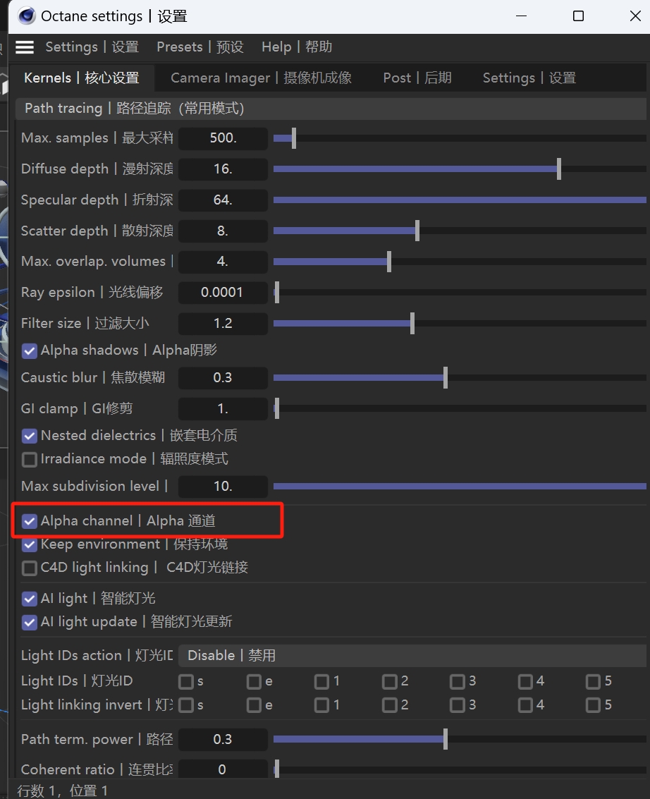 1.打开 Octane 渲染设置 → 主要 标签。 勾选 Alpha 通道 和 保持透明度。