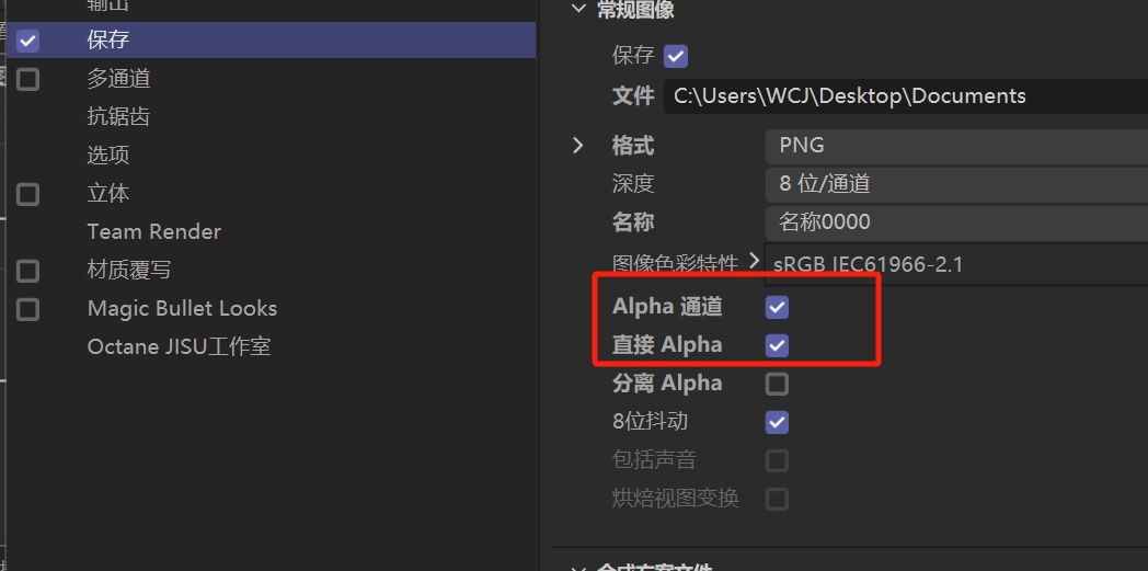 2.渲染设置 –保存 –勾选 Alpha 通道 和 直接 Alpha