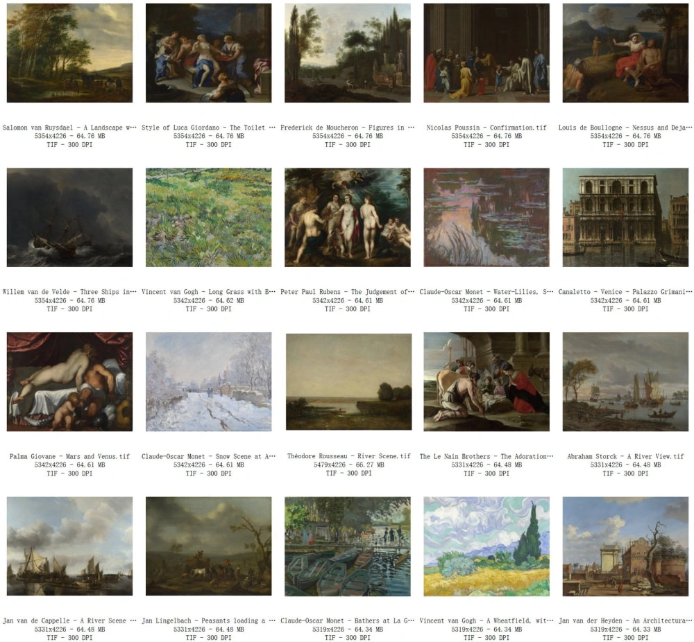 作品以1260年至1900年之间为主。国家美术馆分为东南西北四个侧翼,接年代序展出,早期文艺复兴有达芬奇著名的《圣母子与圣安妮、施洗者圣约翰》炭笔素描。全盛时期有意大利及日耳曼的绘画。1600年至1700年之间有荷兰、意大利、法国、西班牙的绘画。