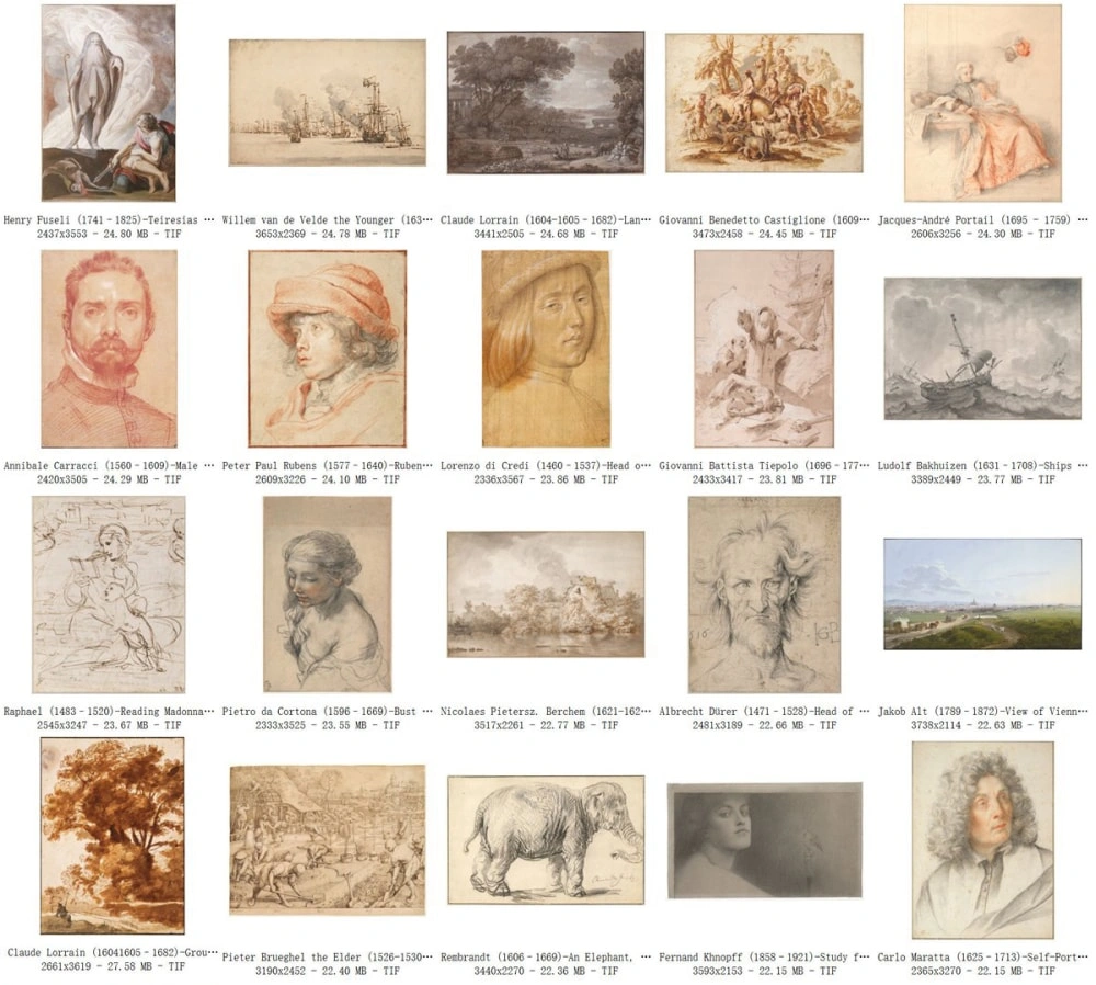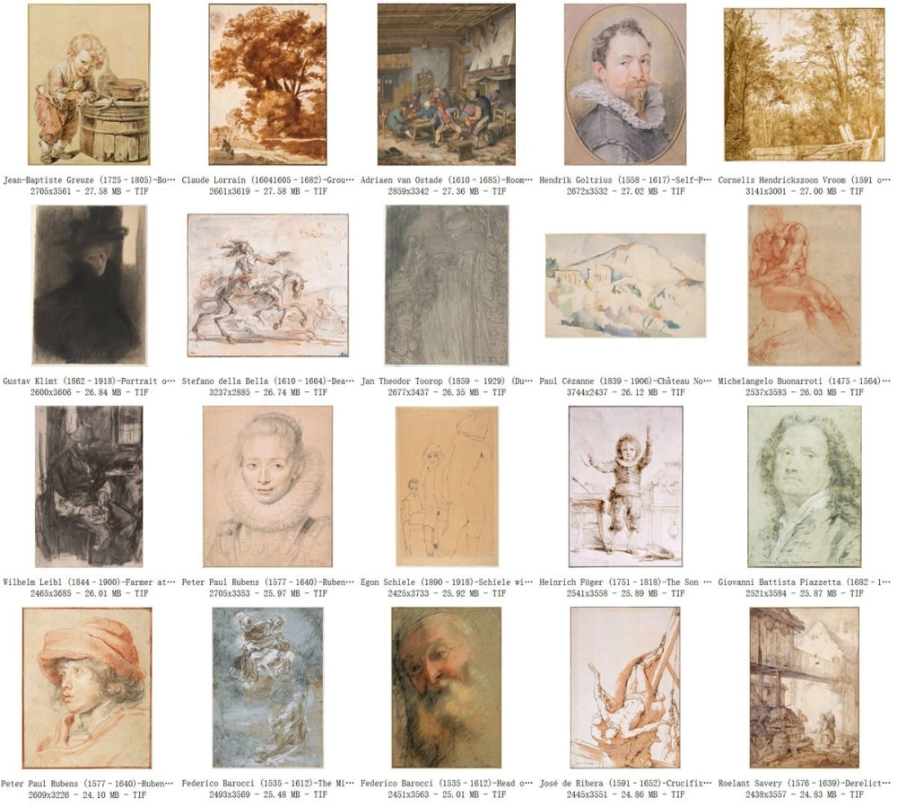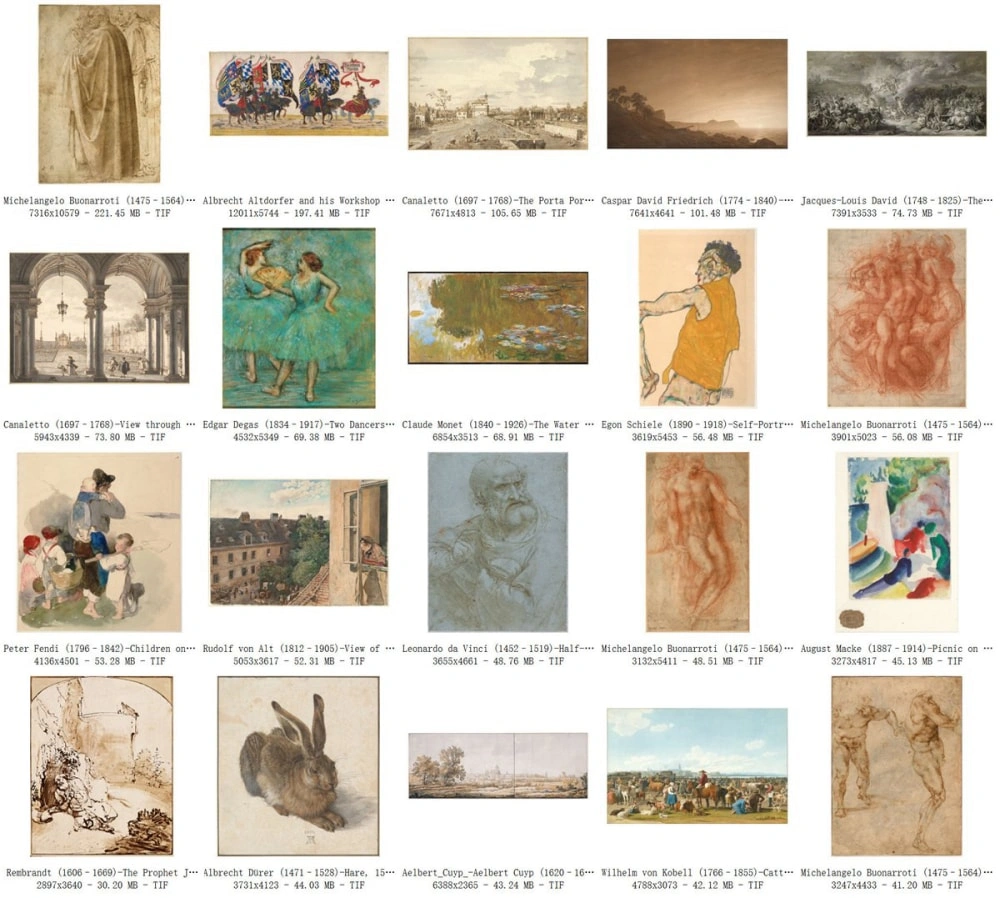 维也纳阿尔贝蒂娜博物馆高清绘画作品,TIF图片格式151幅,文件总大小为 4.8 GB(解压后),每张图片的文件名含有作品名称和艺术家姓名,百度网盘打包下载。如果你需要JPG格式,建议用Xnview免费图片软件批量转换。